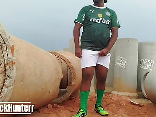 ムラムラしたサッカー選手の男性-マンコ屋外トレーニングで、サッカーキットに精液とミルク浣腸