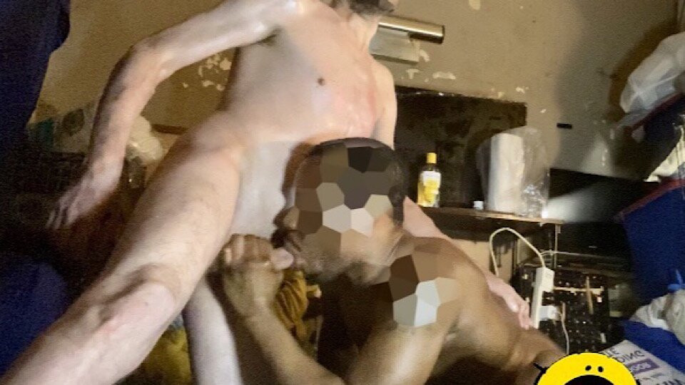 Interracial couple has bareback sex at work. Black top and white bottom.